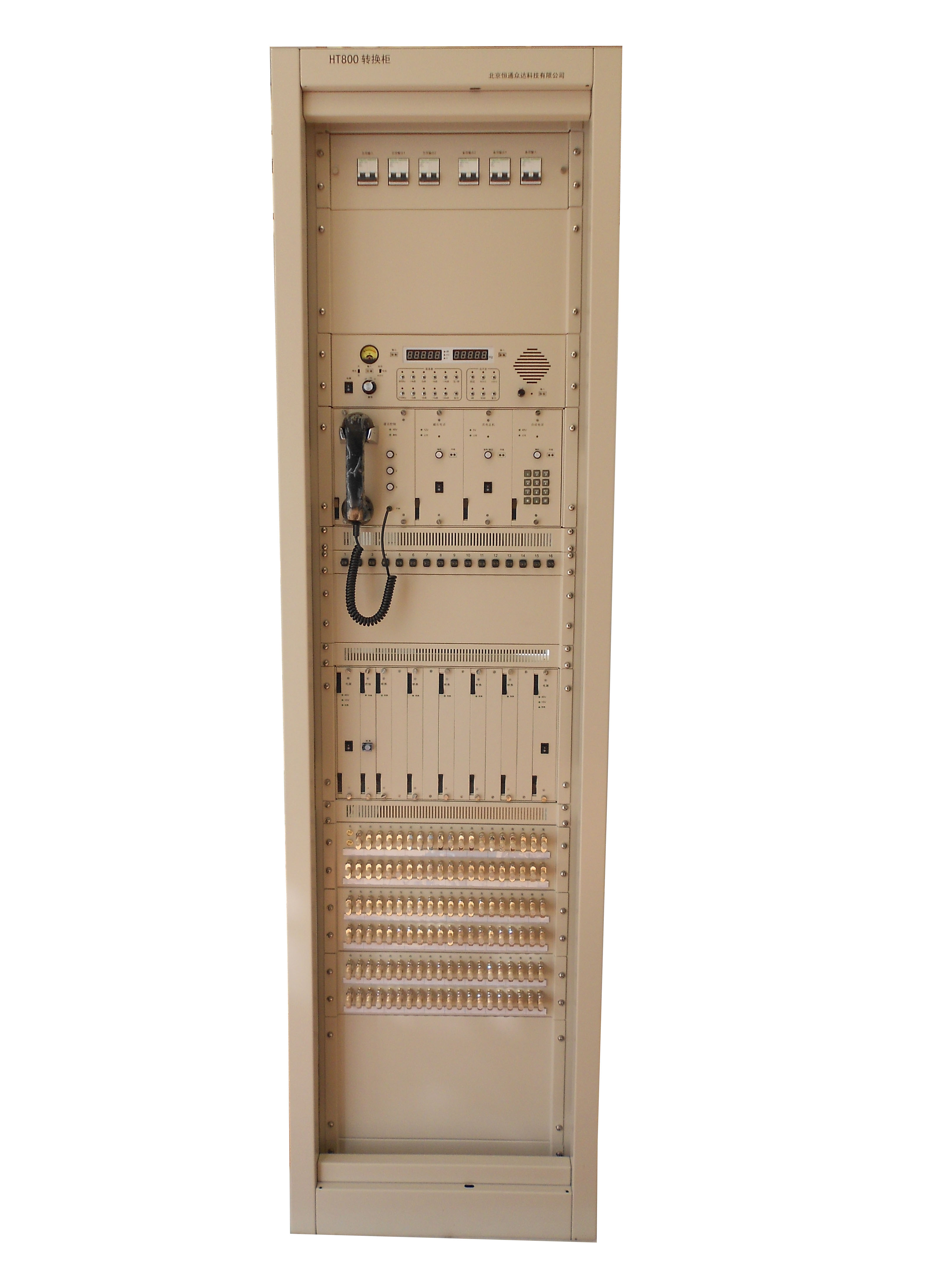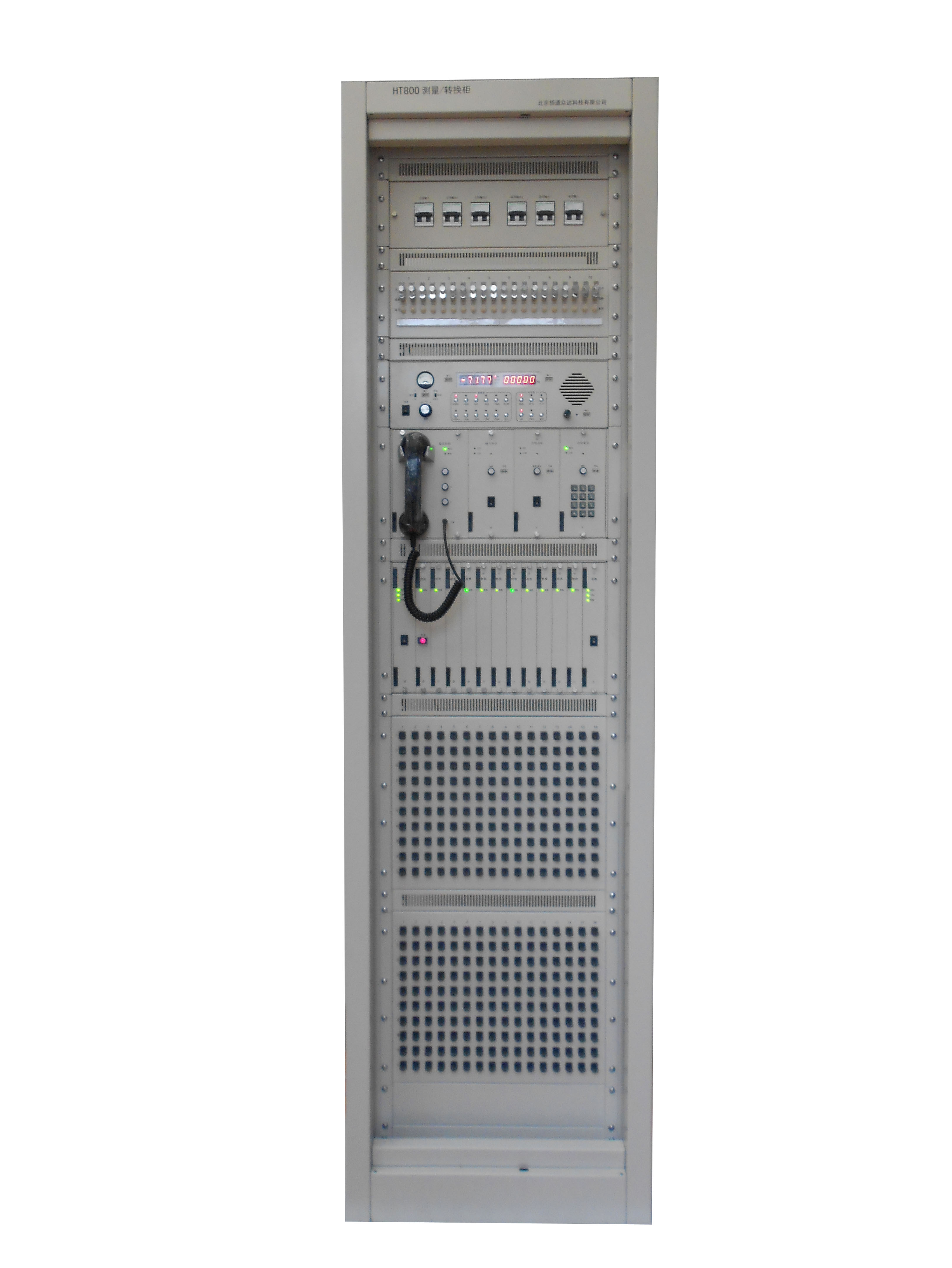 HT800测量/转换柜用于通信设备与外部线路之间配线的引入、连接、测量、转换。可实现外部通信线路(音频线路和数字线路)在两套互为备用的通信设备之间进行快速转换连接,完成通信设备的主机与备机之间的转换。利用机柜内配置的测量仪表和试验测试单元可对设备、线路、终端进行测量、试验,便于日常的维护和故障处理。